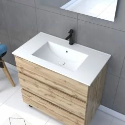 Aurlane Pack Meuble SDB 80cm Sur Pieds 2 Tiroirs Chene_Vasque Resine Blanche + Miroir Led